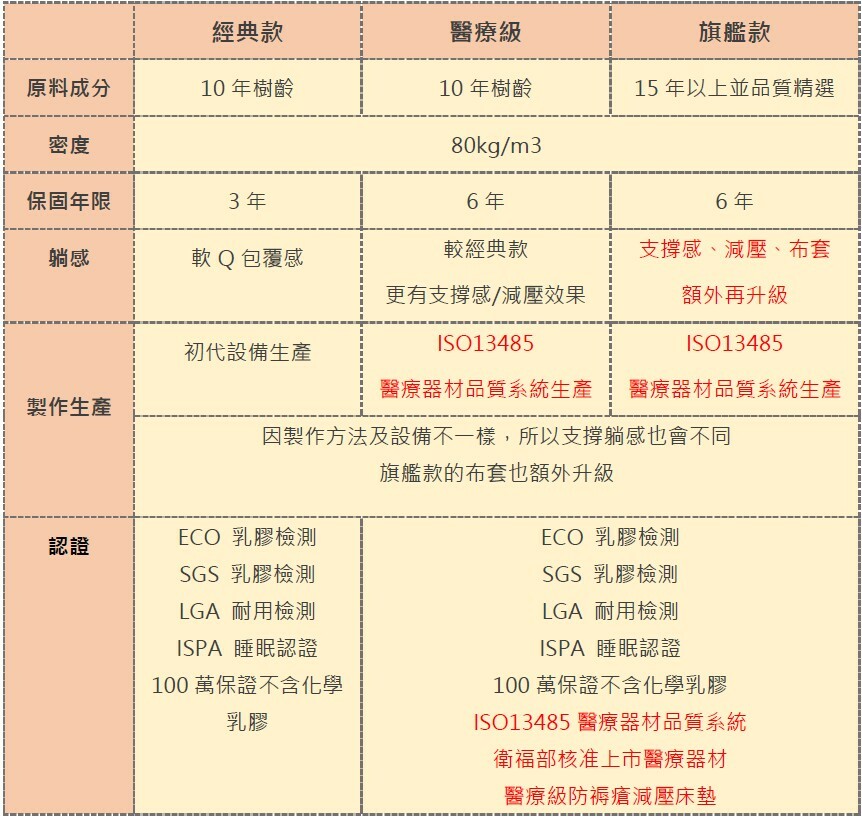 sonmil乳膠床墊主要分成經典款、醫療級、旗艦款,3款都是採用100%天然乳膠成分製作